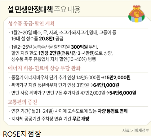 또 설 연휴 기간(1월 21~24일) 고속도로 통행료는 면제하고, 과일과 고기등 16대 설 성수품은 역대 최대 규모로 공급해 명절 물가 안정화에 나선다.