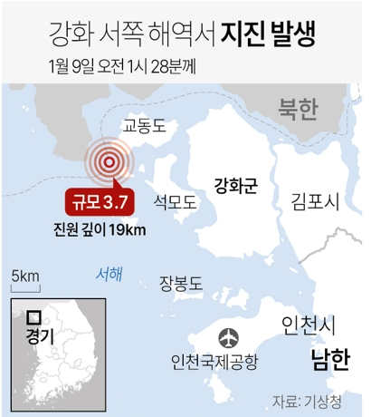 이번 지진은 이날 오전 1시28분쯤 인천시 강화군 서쪽 25㎞ 해역에서 발생했으며, 진원의 깊이는 19㎞로 파악됐다. 애초 지진 규모는 4.0으로 추정돼 기상청 지진 조기경보가 발표됐으나, 추가 분석을 거쳐 규모 3.7로 하향 조정됐다.
