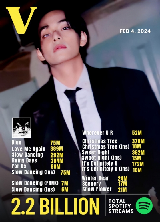 뷔는 지난 2월 4일 기준 자신의 스포티파이 프로필에 등록된 솔로곡 기준으로 총 22억 스트리밍을 돌파했다.