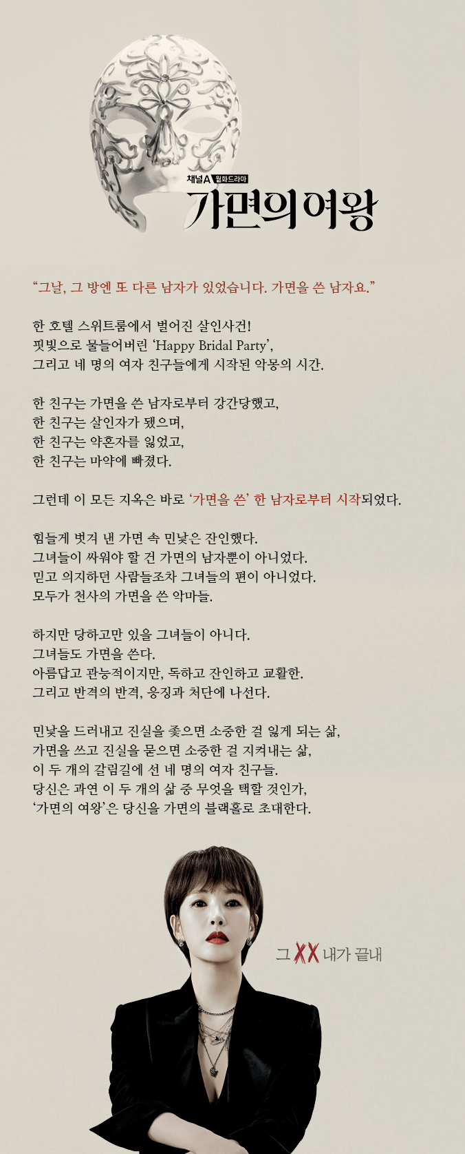 '가면의 여왕'(연출 강호중/극본 임도완)은 화려하게 성공한 세 여자 앞에 10년 전 그녀들의 거짓말로 살인자가 된 절친이 나타나면서 가면에 감춰져 있던 진실이 드러나고, 한 남자로 인해 인생의 소용돌이를 맞게 된 친구들의 욕망이 충돌하는 미스터리 멜로 복수극이다.
