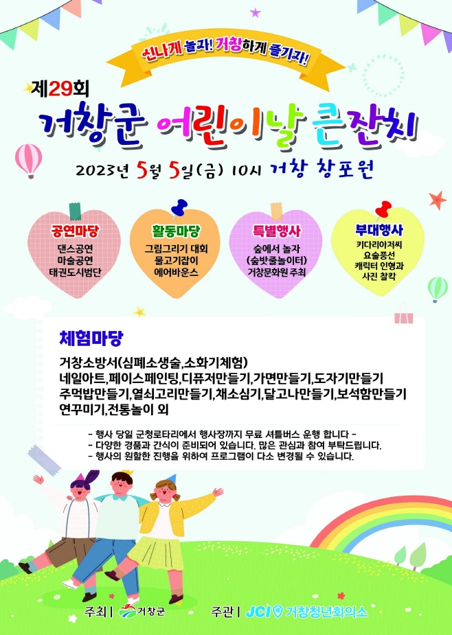 행사를 주관하는 거창청년회의소는 5년째 어린이날 큰잔치 행사를 전담해 '소외계층 사랑의 의류 나눔'과 '식목일 나무 나눠주기', '외국인 계절 근로자 의류 나눔' 등 지역 발전을 위해 다양한 봉사활동을 전개하고 있다.