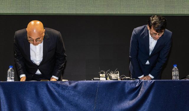 남궁훈(왼쪽), 홍은택 카카오 각자대표가 19일 경기 성남시 판교 카카오 아지트에서 열린 '데이터센터 화재로 인한 장애' 관련 대국민 기자회견을 마친 뒤 고개 숙여 인사하고 있다.