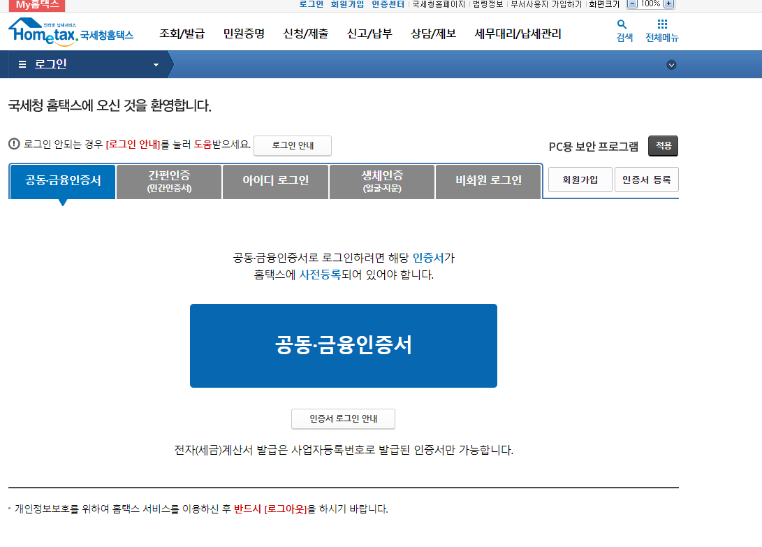 부분적으로 제한이 있을 수 있으니 공인인증서(범용 유료로 발급하는 또는 은행금융인증서 필수) 발급하여 준비하세요.