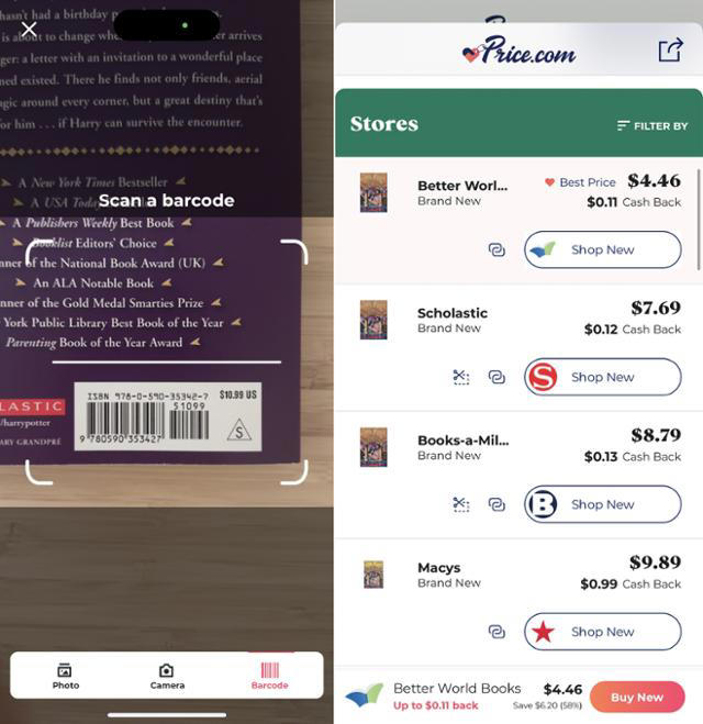 미국 스타트업 프라이스 테크놀로지가 만든 쇼핑 플랫폼 프라이스닷컴(Price.com)은 한국의 가격 비교 사이트와 유사하다. 이 플랫폼은 미국 내 유통점 1만5,000여 곳에서 판매 중인 10억 개 이상의 제품과 연동돼 있어, 원하는 상품을 지금 가장 저렴하게 살 수 있는 곳을 보여준다. 매장에서 마음에 드는 물건을 발견했을 때도 이 앱으로 바코드를 읽으면 더 저렴하게 팔고 있는 웹사이트로 안내해 준다. 프라이스닷컴에서 찾은 사이트로 들어가 구입을 완료하면, 지불한 물건값의 1%부터, 많게는 35%까지 현금으로 돌려받을 수 있다.