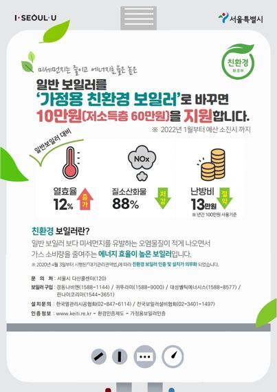 더구나 콘덴싱보일러는 미세먼지의 원인인 질소산화물과 온실가스인 이산화탄소 배출도 크게 줄일 수 있어 대기질 개선에도 도움이 된다. 이에 지난 2020년부터 사용이 의무화됐으며 지난 2018년부터 환경부와 지자체 주도로 보급을 확대하기 위한 지원사업을 진행 중이다. 이 제도를 활용하면 보일러 교체 시 10만원의 지원금을 받을 수 있다.