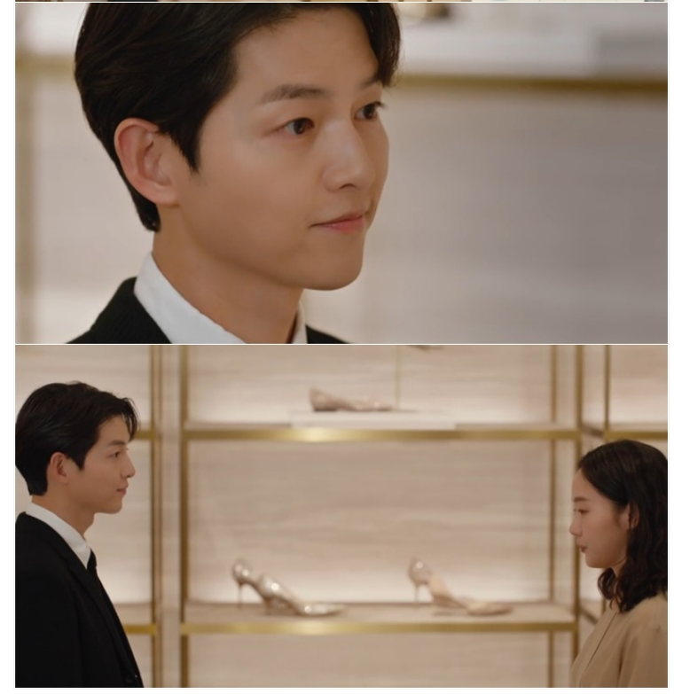 이후 오인주는 진화영의 구두를 신고 해당 매장을 찾았다. 송중기는 구두 매장의 직원으로 등장했다. 깔끔한 슈트를 입고, 환한 미소로 손님을 맞았다. 그는 오인주의 구두를 바라보며 "저희 제품을 신으셨네요. 한국에 세 페어밖에 안들어오는 귀한 컬렉션이죠. 근사하게 어울리세요"라고 말을 걸었다.