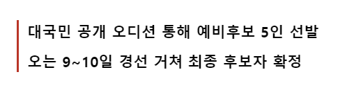 공개 오디션에는 총 14명의 청년들이 지원한 가운데 1차 심사를 거쳐 권지웅·김규현·김동아·성치훈·전수미 예비후보가 참여했다. 이날 오디션을 통과한 경선 후보 3인은 향후 권리당원 및 지역 유권자 투표를 거친다.