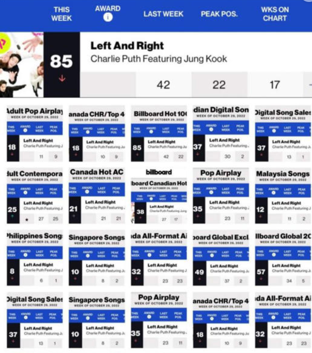 'Left and Right'는 이 밖에도 2022년 10월 29일 자 디지털 송 세일즈 37위, 빌보드 글로벌 200 57위, 빌보드 글로벌(미국 제외) 49위, 팝 에어플레이 35위, 어덜트 팝 에어플레이 18위, 어덜트 컨템포러리 25위, 캐나디안 핫100 38위, 캐나디안 핫 AC 21위, 캐나다 CHR/톱40 18위, 캐나다 올-포멧 에어플레이 32위, 캐나다 디지털 송 세일즈 37위, 필리핀 송 8위, 싱가포르 송 10위, 말레이시아 송 12위 등 빌보드 세부 차트에서도 장기 포진하며 음원 맹활약을 이어가고 있다.