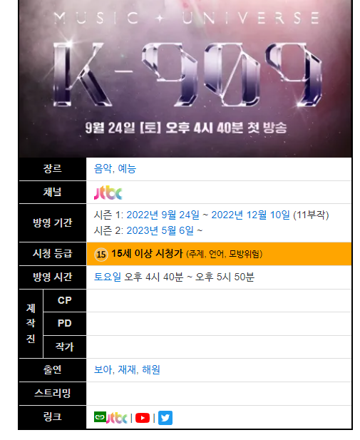 JTBC에서 방영된 음악 예능 프로그램. 뮤직 유니버스 K-909라고도 한다.