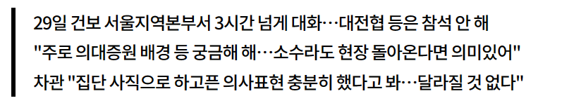 그러면서도 "비록 소수지만 그분들도 하고 싶은 말들을 했고, 저희도 하고 싶은 이야기들을 해서 이해의 공감을 넓혔다"며 "전체 몇 천 명의 전공의들에게 어떻게 전달될지는 (모르지만) 분명 전달되는 루트가 있을 거라고 본다"고 설명했다.