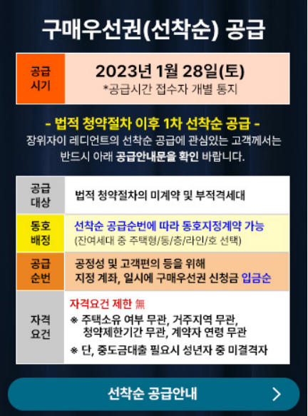 무순위 청약은 수분양자의 자격을 제한하지만 선착순 분양은 아무런 자격 제한이 없어 물량을 비교적 빨리 소진할 수 있다. 무순위 청약은 최초 공급 당첨 후 포기자나 부적격자, 다른 지역 거주자, 유주택자·조합원 등을 제한하지만 선착순 분양에서는 이같은 자격 제한이 없다. 장위자이레디언트의 경우, 자격 요건에'계약자 연령 무관'까지 명시해 "사람이기만 하면 된다"는 우스갯소리까지 나왔다.