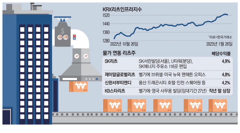 26일 한국거래소에 따르면 상장 리츠 및 인프라스트럭처 기업들을 포함한 KRX리츠인프라지수는 지난해 말 1419에서 지난 25일 1528로 7.7% 상승했다. 같은 기간 코스피 상승률 8.5%와 비교하면 소폭 낮지만 상장 리츠 배당수익률이 통상 4~6% 이상이라는 점을 고려하면 코스피 투자보다 성과는 좋은 편이다.