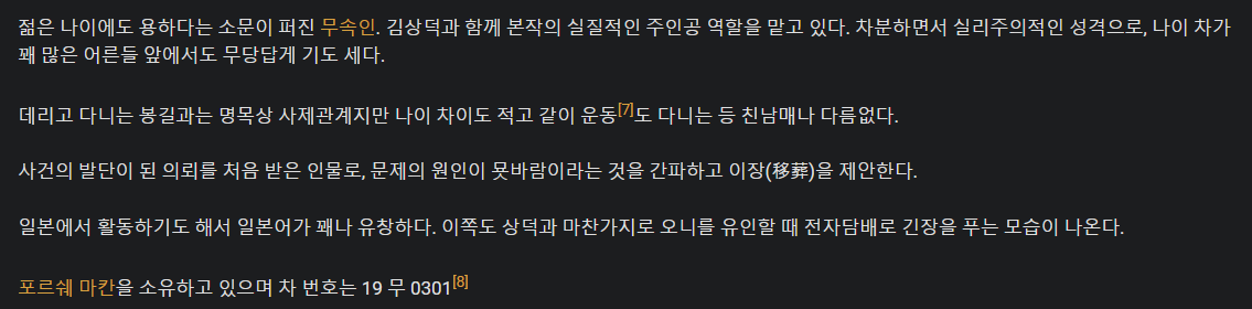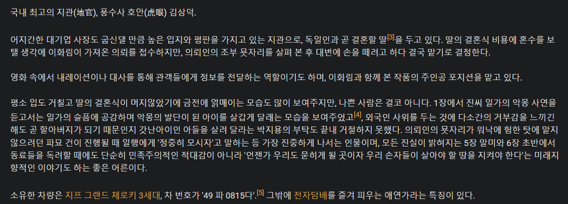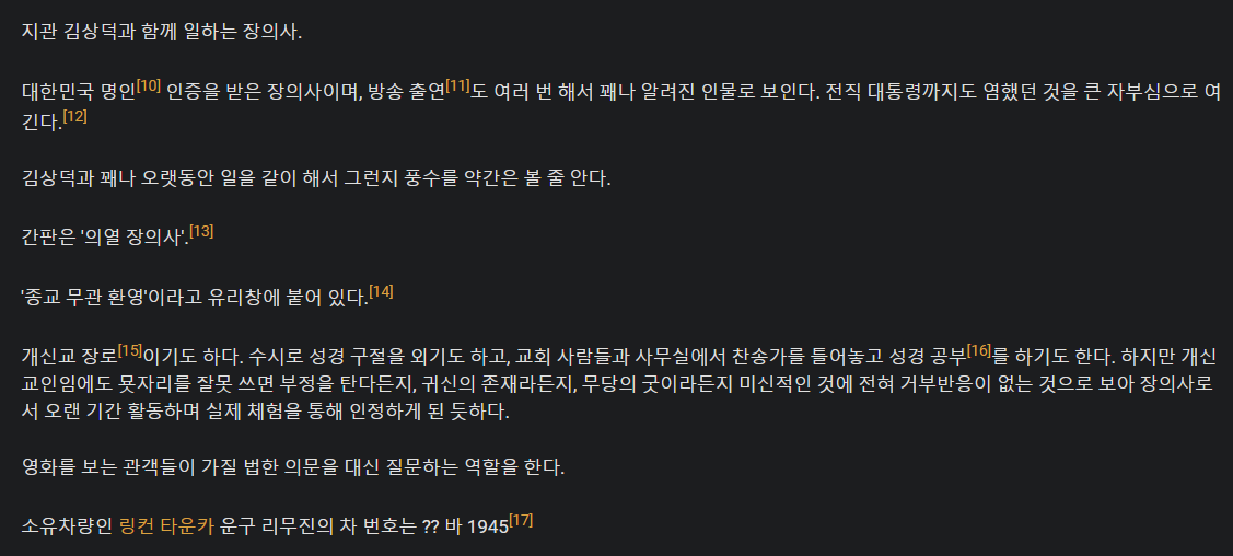 전작인 사바하에서도 그랬듯, 주연 4인방 전원 다분히 세속적이고 속물적인 모습을 보인다. 김상덕과 고영근은 거액의 돈 때문에 일에 착수하고 이화림 역시 만만찮게 돈을 밝힌다는 묘사가 있다. 다만 그렇다고 해서 본성이 악하거나 무능한 인물들은 절대 아니다. 전작 사바하의 무속인들도 외제차를 소지하고 명품을 착용하는 등 세속적인 면모가 있긴 했어도 굿이 실패로 끝난 후 자진해서 밤중에 마을에 남아 단독으로 그 존재를 추적할 만큼 사명감과 직업 의식이 투철했으며 "그것"의 존재가 너무 강해서 티는 안 났지만 본업에 있어서도 상당한 프로들이었다.