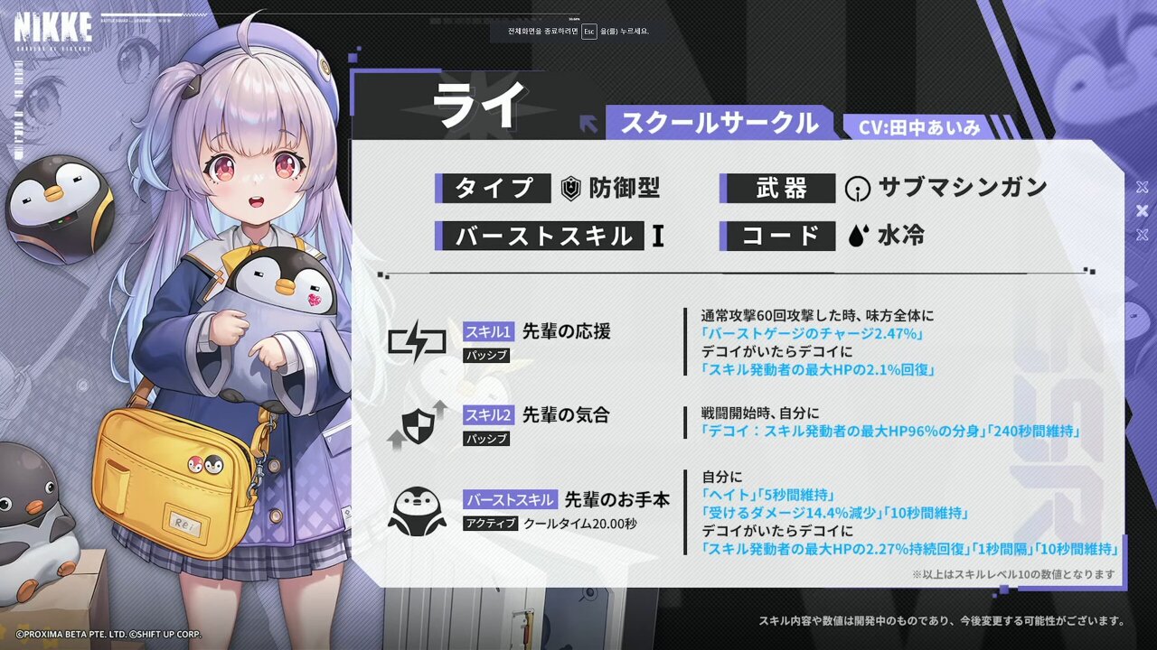 1스킬 패시브로는 마지막 탄환으로 공격했을 시 아군 전체의 버스트 스킬 쿨타임을 줄여주고, 특수한 발현 상태일 경우 아군 전체에게 적 파츠를 공격하고 파츠에 대해 5초간 대미지를 증가시키는 스킬을 갖고 있다. 2스킬을 쿨타임 20초로 적 전체를 공격하며, 버스트 스킬은 2스킬의 쿨타임을 줄이고, 지정된 적 대상 1기에 피격 대미지를 10초간 누적한 후 적 전체에게 높은 계수(10레벨 기준 8900%)의 피해를 분배하여 한번에 대미지를 주는 효과를 갖고 있다(해당 수치 및 스킬 효과들은 개발중인 사양이다).