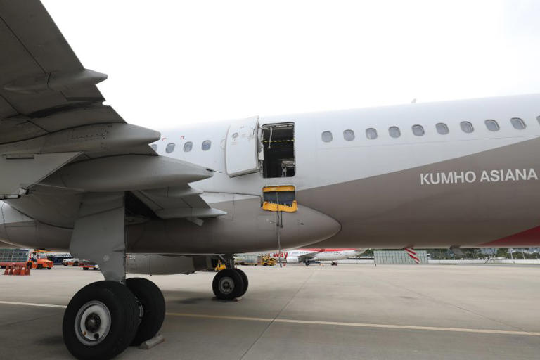 26일 오후 비상문이 개방된 채 대구공항에 착륙한 아시아나항공 항공기가 사고 관련 조사를 위해 계류장에 대기하고 있다.