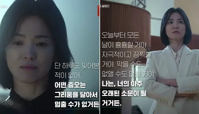 먼저 학교 폭력 피해자로 17년간 갈아온 복수의 칼날을 휘두르기 시작한 문동은(송혜교 분)은 "오늘부터 모든 날이 흉흉할 거야. 자극적이고 끔찍할 거야. 막을 수도, 없앨 수도 없을 거야. 나는, 너의 아주 오래된 소문이 될 거거든"이라는 대사로 가슴 깊이 묻어놨던 복수심을 드러냈다.