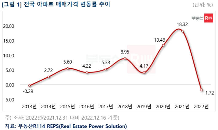 전국 아파트값은 2013년 이후 상승세를 이어가는 가운데 2020년(13.46%)과 2021년(18.32%)에는 2년 연속 두 자릿수 상승률을 기록했다. 하지만 올해 들어 매수세가 급격히 위축되면서 전국 아파트 매매가격 변동률이 1.72% 떨어져 9년 만에 마이너스 전환됐다. 지방 일부 지역을 제외하고는 대부분 하락세로 돌아섰다.