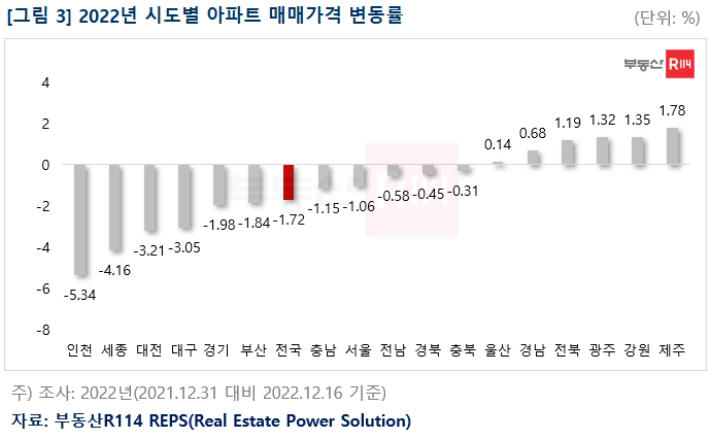 지역별로는 2021년 한 해 34.52% 올라 전국에서 상승폭이 제일 컸던 인천이 5.34% 떨어져 가장 많이 하락했다. 인천은 가격 급등과 함께 대규모 아파트 공급이 영향을 줬다. 이어 세종시가 4.16% 떨어졌다. 세종시는 2020년 행정수도 이전 등의 이슈로 아파트값(42.81%)이 천정부지로 치솟았고, 이듬해인 2021년 10월 마이너스로 돌아선 뒤 1년 넘게 약세가 계속되고 있다. 대전은 2019~2021년까지 3년간 두 자릿수 오른데 따른 가격 부담이 크게 작용하면서 3.21% 내렸다. 이어 △대구(-3.05%) △경기(-1.98%) △부산(-1.84%) △충남(-1.15%) △서울(-1.06%) △전남(-0.58%) △경북(-0.45%) △충북(-0.31%) 순으로 하락했다.