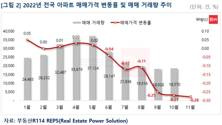 코로나19 이후 0%대 수준을 유지했던 기준금리가 지난해 8월 0.25%포인트 인상을 시작으로 가파르게 오르면서 역대급 거래정벽이 이어지고 있다. 전국의 아파트 매매 누적 거래량(1~10월)은 26만2084건으로 2021년 같은 기간(59만7557건)보다 56.1% 줄었다. 특히, 서울 아파트 월별 매매 거래량은 7월 이후 1000건 이하로 떨어져 관련 통계가 집계된 이후 최저 수준을 기록했다. 역대급 거래절벽이 이어지면서 전국 아파트 매매 변동률은 6월 들어 -0.04%로 마이너스 전환됐고, 이후에도 하락세가 계속됐다.