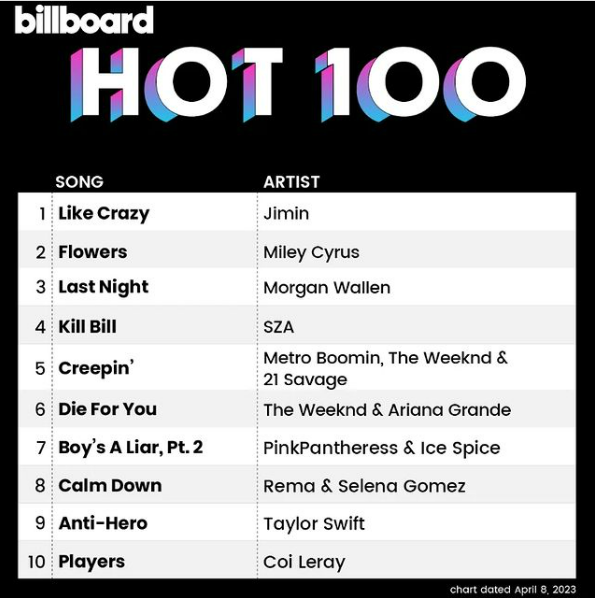 지민 이전에는 방탄소년단만이 유일하게 ‘핫 100’ 1위 기록을 가지고 있었다. 팬덤 ‘아미’의 화력 덕분이다. 다른 팝 가수에 견줘 음원 스트리밍과 라디오 방송에서 뒤처지는 방탄소년단을 위해 팬들은 열성적으로 음원과 시디를 구매했다. 그 결과 ‘다이너마이트’를 시작으로 모두 6곡이 ‘핫 100’ 정상에 올랐다.