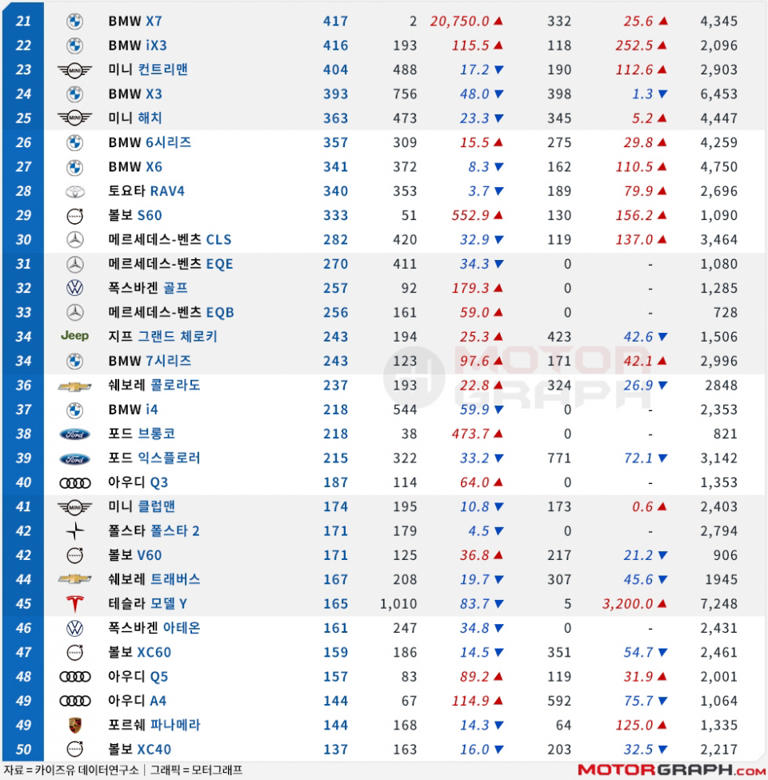 폭스바겐(2678대)과 아우디(2642대)는 나란히 3·4위에 올랐다. 두 회사는 일부 모델에 20%의 파격 할인 혜택을 내세우며 판매량을 끌어올렸다. 덕분에 아우디 A6(1710대)와 폭스바겐 티구안(1596대)가 월간 베스트셀러 3·4위를 기록했다. 연간 판매량은 아우디(2만1419대)가 폭스바겐(1만5792대)을 여유있게 앞섰다.