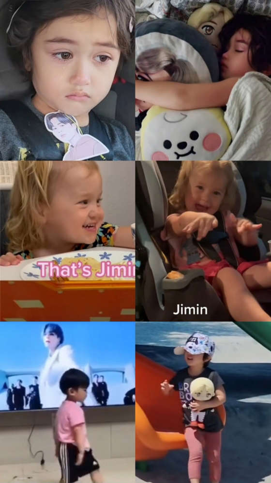 또 다른 틱톡 영상에서는 갓 걸음마를 뗀 듯한 아기가 'ON' 영상을 보고 완벽한 타이밍에 지민의 댄스 브레이크 파트를 따라했고, 한 아이는 차 안에서 '다이나마이트'에 맞춰 춤을 추며 지민의 목소리가 나오자 단숨에 '지민'을 외치는 모습이 담겼다.