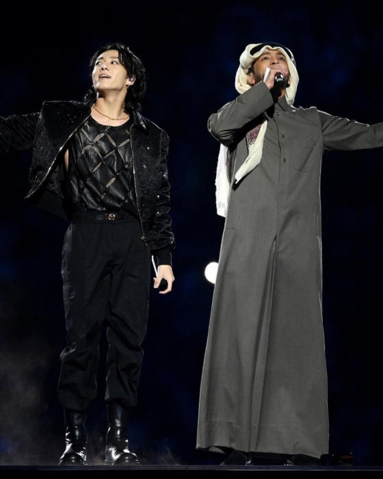 정국과 카타르 국민 가수 파하드 알 쿠바이시의 개막식 엔딩 장면이 담긴 사진에서는 국경, 인종, 세대를 초월한 '인류 화합'이라는 공연 메시지를 전하는 듯해 커다란 울림을 선사했다.