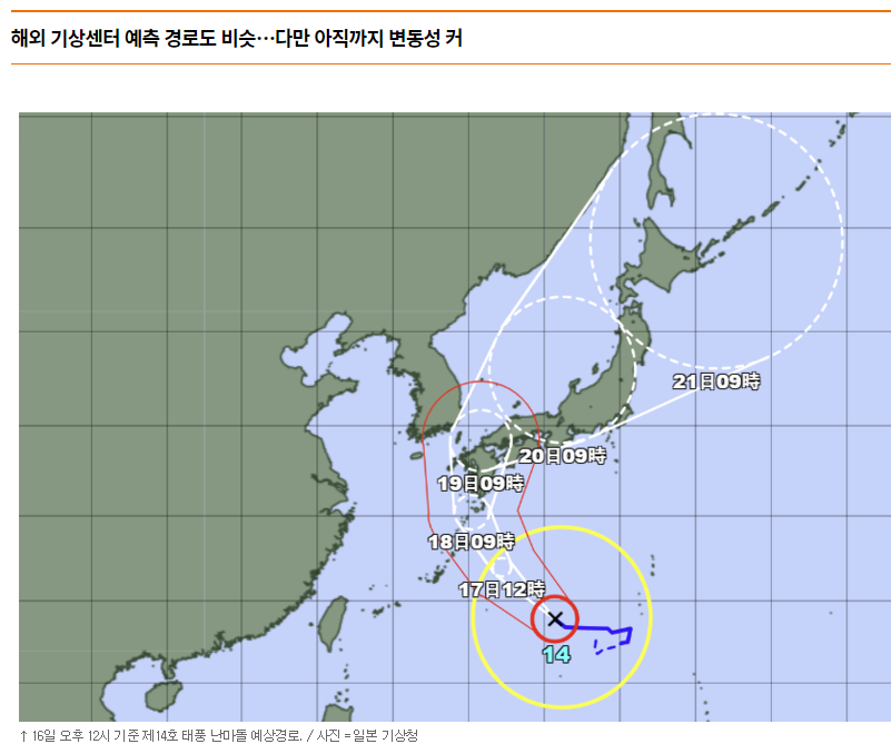 16일 오후일기예보에 따르면 제14호 태풍 난마돌이 오는 19일 한반도에 가장 근접할 것이라는 예측이 나왔습니다. 이날 경상 해안에는 태풍의 영향으로 많은 비가 내릴 전망입니다.