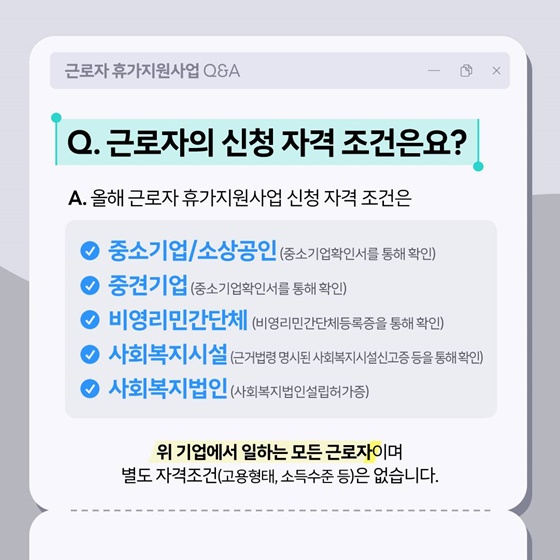 A. 올해 근로자 휴가지원사업 신청 자격 조건은