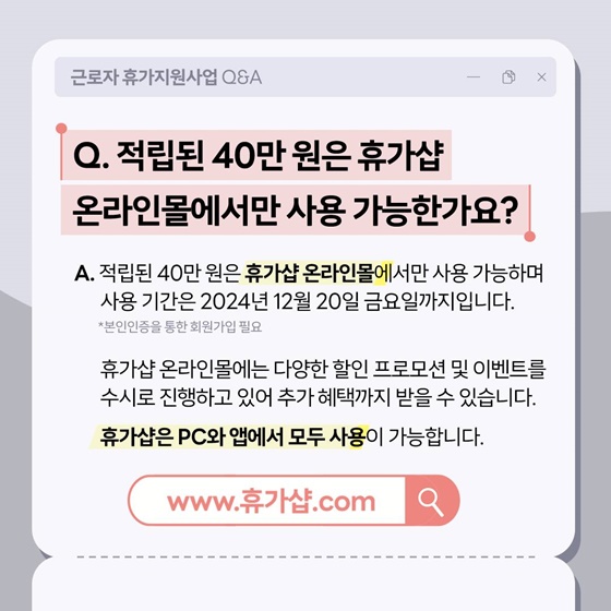 A. 적립된 40만 원은 휴가샵 온라인몰에서만 사용 가능하며 사용 기간은 2024년 12월 20일 금요일까지입니다.