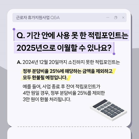 A. 2024년 12월 20일까지 소진하지 못한 적립포인트는 정부 분담비율 25%에 해당하는 금액을 제외하고 모두 환불될 예정입니다.