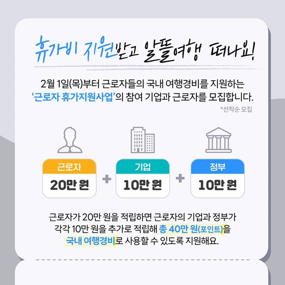 2월 1일(목)부터 근로자들의 국내 여행경비를 지원하는 ‘근로자 휴가지원사업’의 참여 기업과 근로자를 모집합니다.