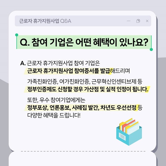 A. 근로자 휴가지원사업 참여 기업은 근로자 휴가지원사업 참여증서를 발급해드리며 가족친화인증, 여가친화인증, 근무혁신인센티브제 등 정부인증제도 신청할 경우 가산점 및 실적 인정이 됩니다.