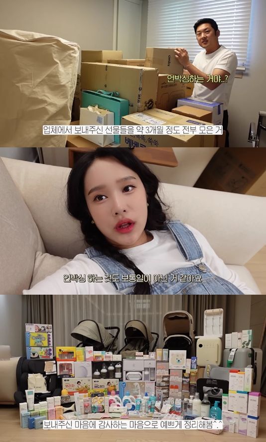 헤이지니는 유축기부터 화장품, 마스크팩, 괄사, 루이보스차, 출산용 달력, 기저귀, 유모차, 카시트 등 육아 용품 및 산모 용품까지 다양한 선물을 받았다.