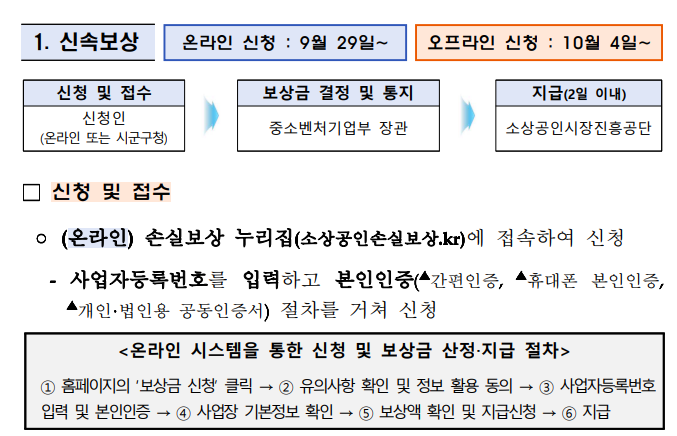 9월29일부터 10월3일까지 온라인 신청 사업자등록번호 5부제 운영하고, 신속보상대상자만 해당됩니다.