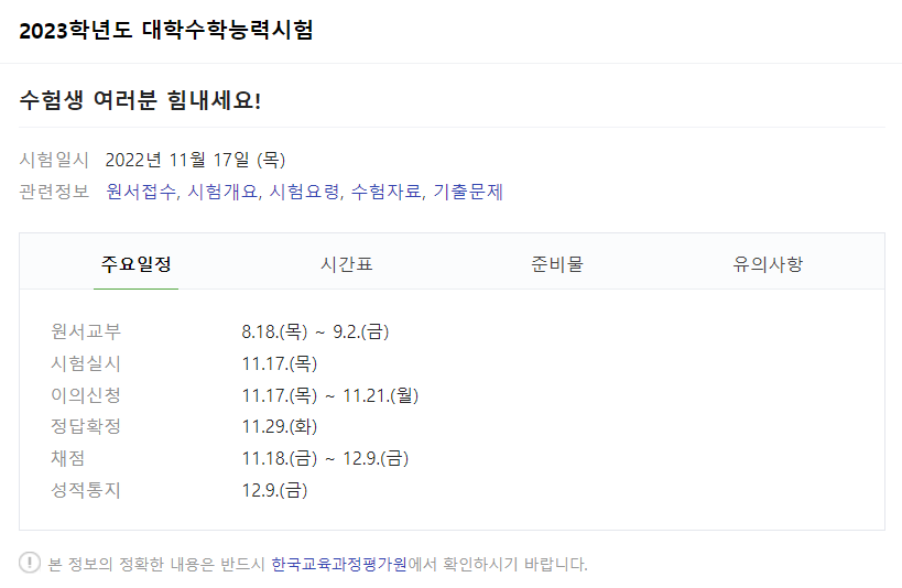 아래는 한국교육과정평가원 대학수학능력시험 정보입니다~ 참고하시기바랍니다^^