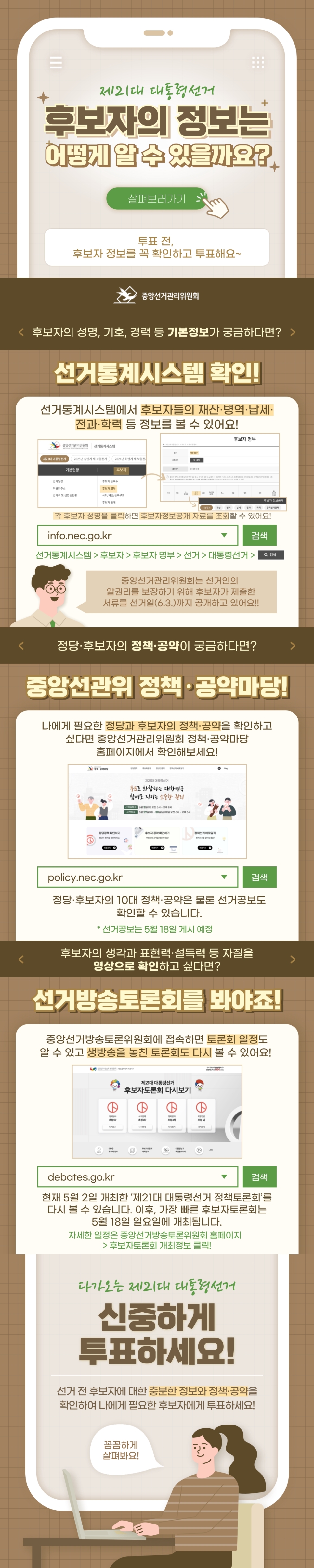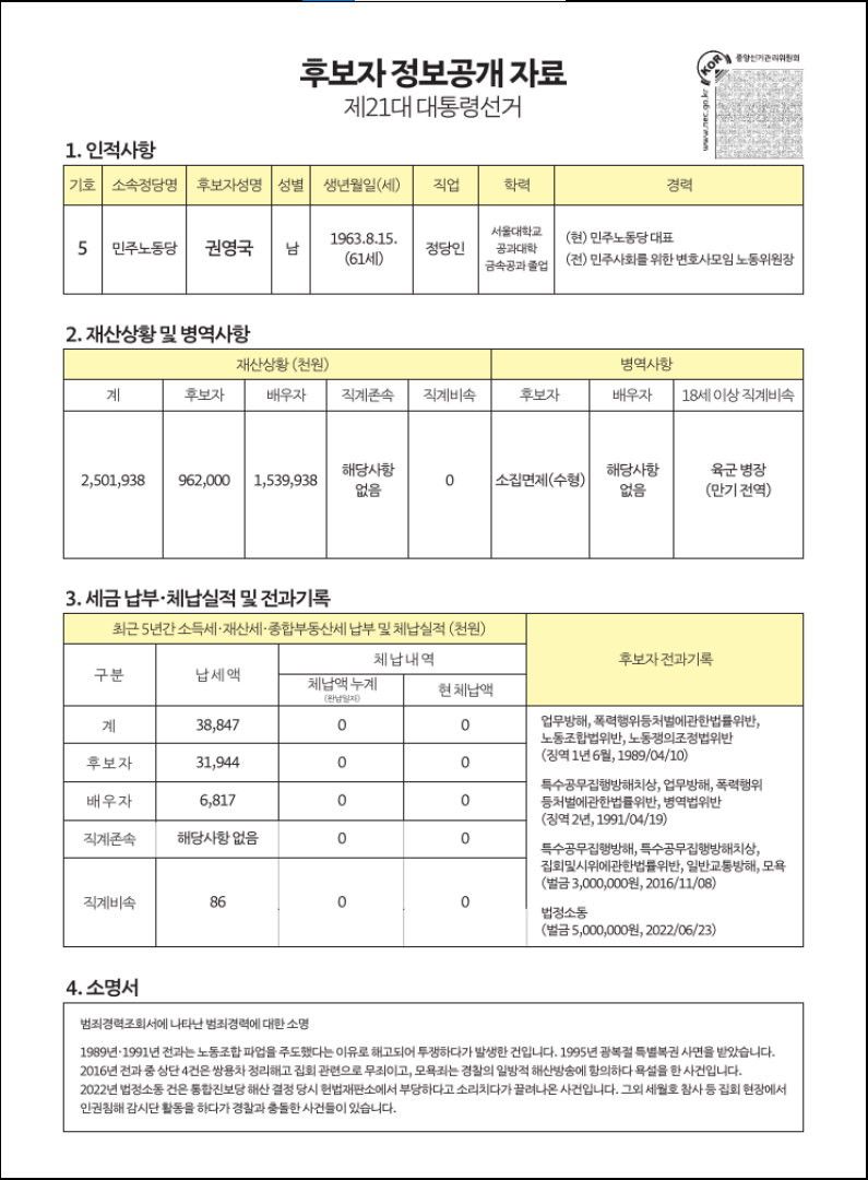 - 또한, 유권자들이 후보자에 대한 정보를 쉽게 접할 수 있도록 중앙선관위 홈페이지와 모바일 앱을 통해 상세한 정보가 제공되고 있습니다.