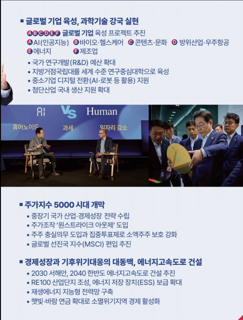- 김문수 후보 (국민의힘): 김문수 후보는 ‘경제 회생’을 최우선 과제로 삼고 있습니다. 그는 대기업 중심의 경제 성장보다는 중소기업과 자영업자 지원을 강화하는 정책을 내세우고 있습니다. 특히, 규제 완화와 세제 혜택을 통해 기업의 투자 활성화를 유도할 계획입니다.