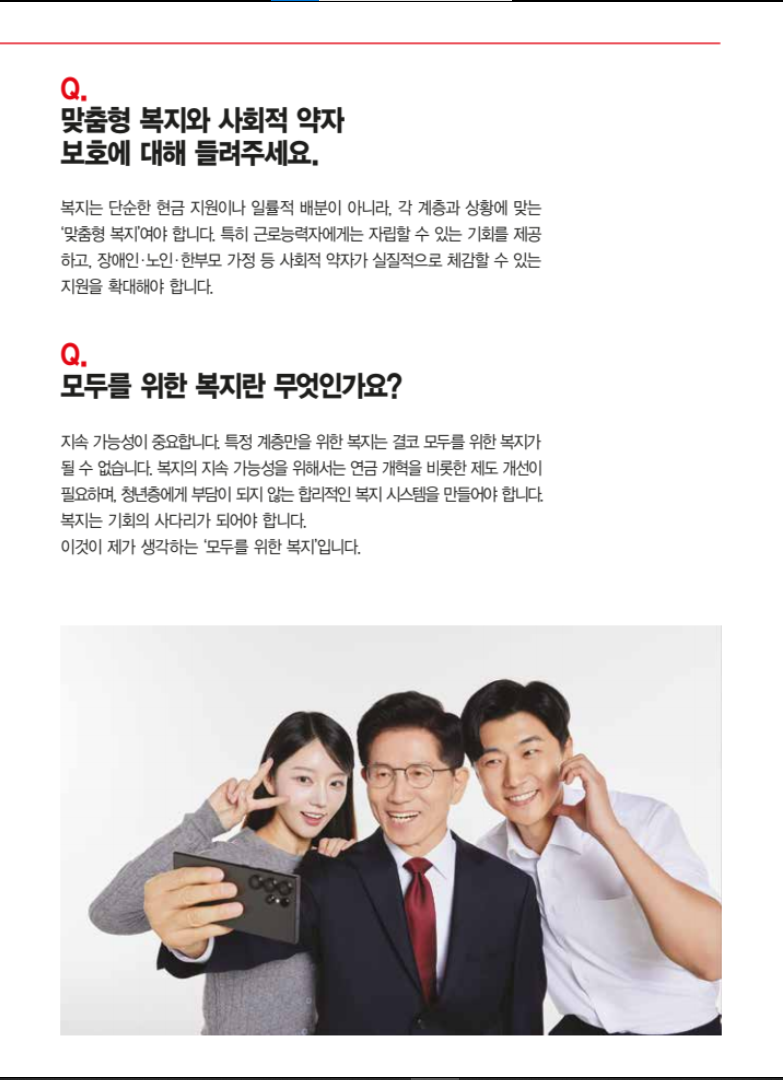 • 복지 정책 강화: 사회적 약자를 위한 복지 정책을 강화하고, 노인 복지 및 장애인 지원 확대를 약속했습니다.