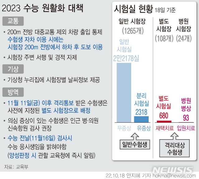 교육부가 18일 발표한 2023학년도 수능 시행 원활화 대책에 따라 수험생들이 알아야 할 내용을 정리했다.