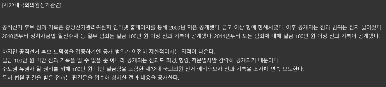 서울지역 예비후보는 2024년 1월 19일 기준 170여 명이었다. 예비후보 중 40% 이상이 범죄 전력을 가진 셈이다.