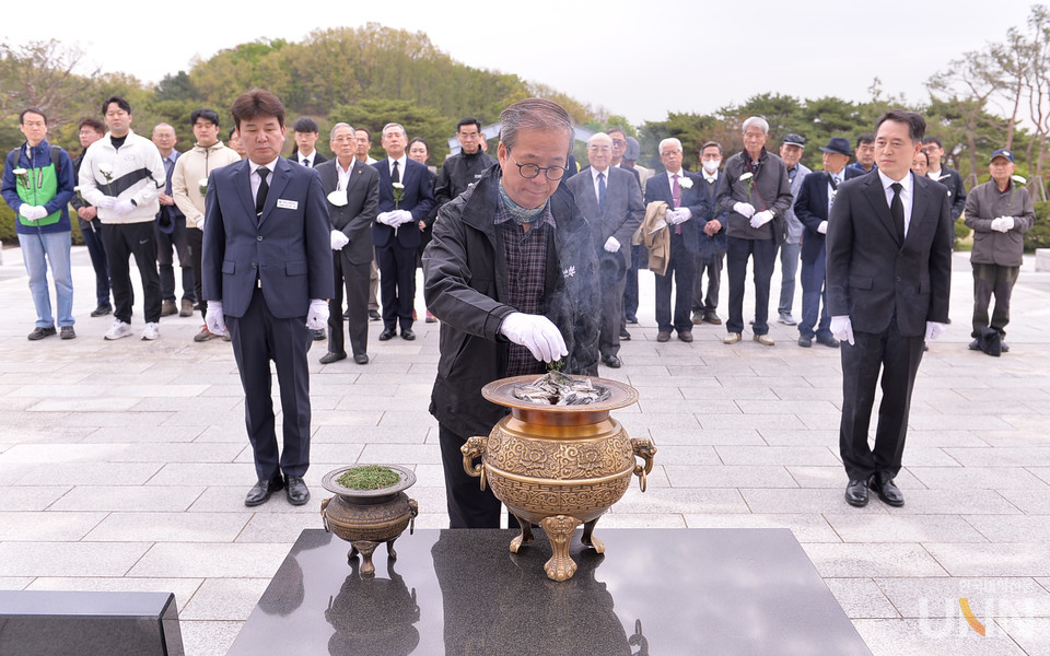 분향과 헌화하고 있는 윤재웅 총장(두번째, 세번째) 4.19 민주묘지에는 동국대 희생자 29기의 동문이 안장돼 있다.
