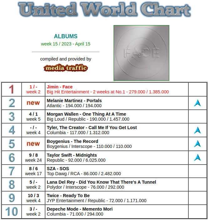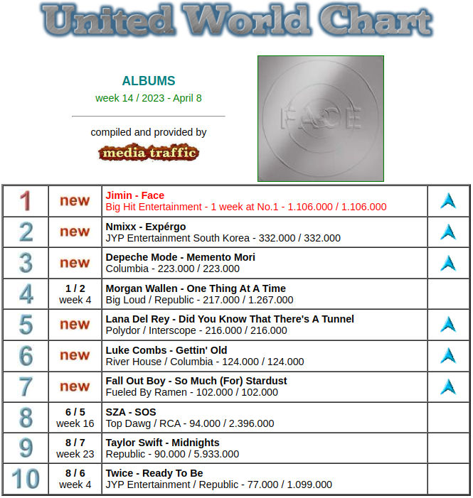 지민의 첫 솔로 앨범 ‘페이스’(FACE)가 ‘유나이티드 월드 차트’(United World Chart) 2023년 14주 차(4월 8일) 앨범 부문 1위에 올랐다.