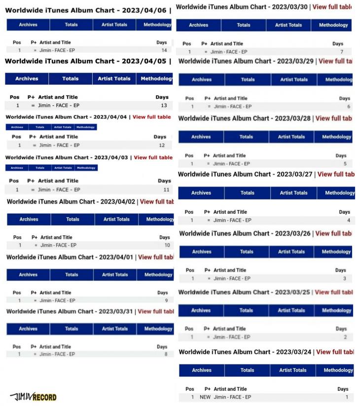 또한 ‘페이스’는 월드와이드 아이튠즈 앨범 차트에서 14일 연속(2023년 3월 24일~4월 6일) 1위에 올라 방탄소년단의 ‘맵 오브 더 소울:7’(MAP OF THE SOUL:7)과 타이기록을 세웠다.