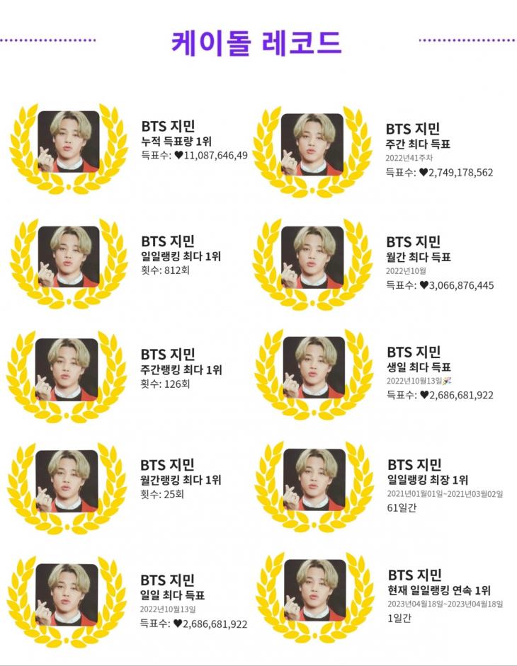 지민은 글로벌 팬들을 대상으로 하는 K팝 아이돌 인기투표 사이트 '케이돌' 4월 셋째 주(2023년 4월 10일 - 2023년 4월 16일)주간 랭킹에서 1위를 차지했다.