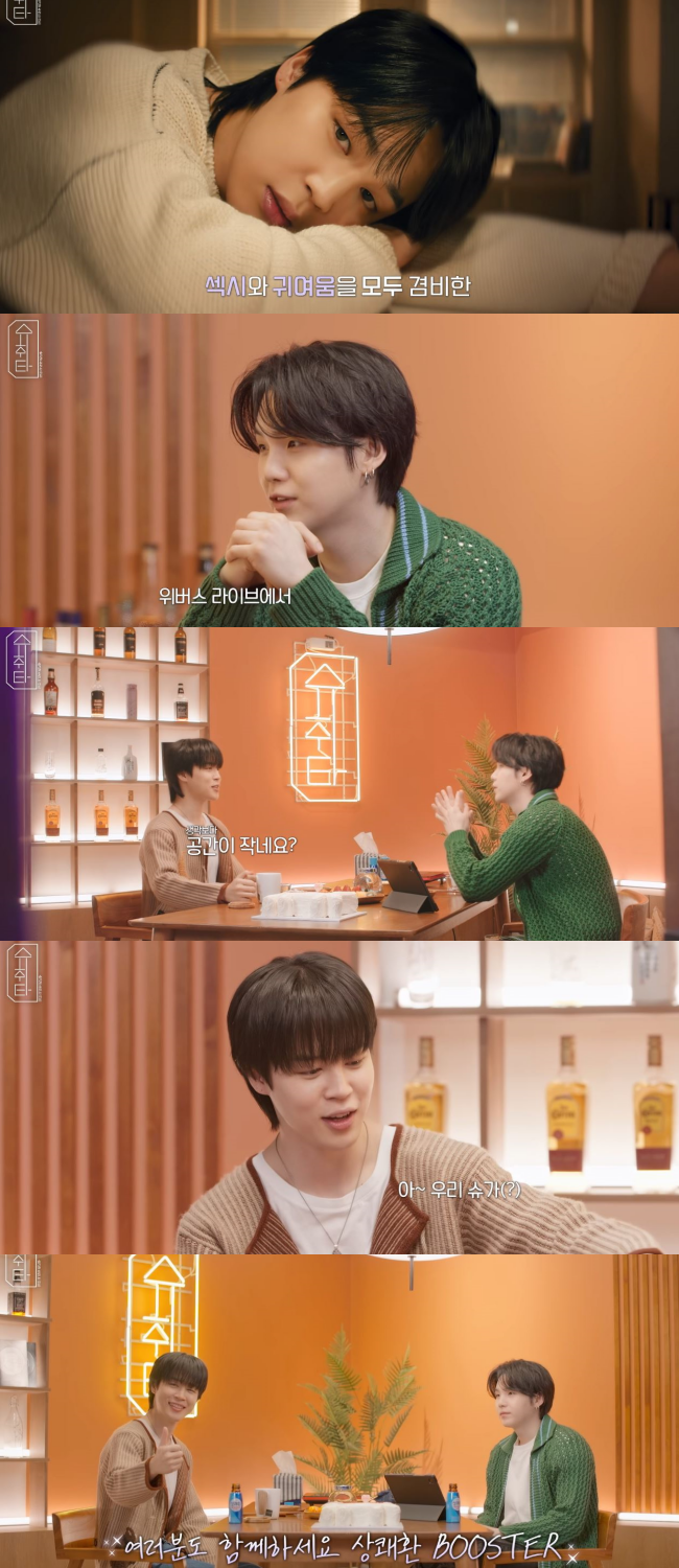 공개된 영상에는 방탄소년단의 유튜브 콘텐츠 ‘슈취타’에 게스트로 지민이 나온 모습이 담겨있다. ‘슈취타’는 슈가와 함께 게스트가 가져온 술을 마시며 인터뷰 형식으로 진행되는 콘텐츠다.