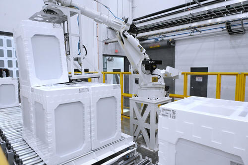 빅데이터·머신러닝을 이용해 성능 검증을 마친 제품은 공장에서 자체 제작한 스티로폼 포장재를 씌워 완제품 창고로 옮겨진다.